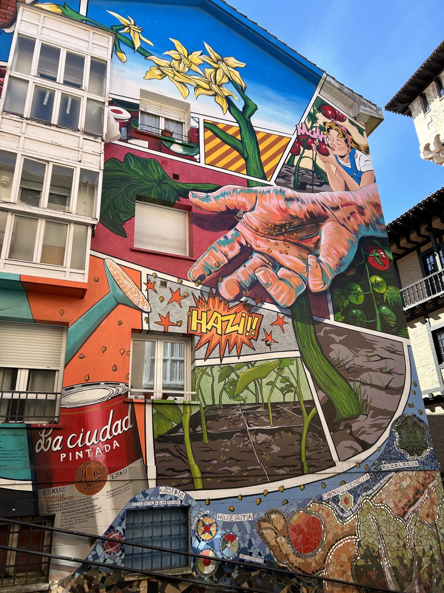 Se trata de grandes obras de arte urbano pintadas en fachadas de edificios. Uno de los más conocidos es “El Triunfo de Vitoria”.